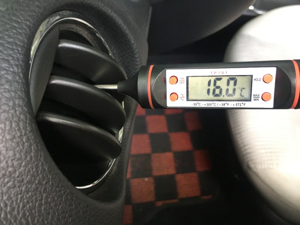 經(jīng)過3分鐘,通過專業(yè)測溫計可以看到,空調(diào)最低溫度是16℃。