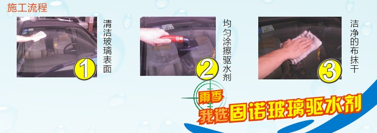 駛安全的水滴“滾”吧!固諾玻璃驅(qū)水劑具有特強(qiáng)驅(qū)水效果,滴在玻璃上面的水珠會自動(dòng)滾落。在雨天,當(dāng)雨水滴到用過驅(qū)水劑的玻璃上,會凝結(jié)成水珠,在車速大于40km/h時(shí),水珠自動(dòng)滾落。令視野更加清晰,提高雨天行駛的安全性。
