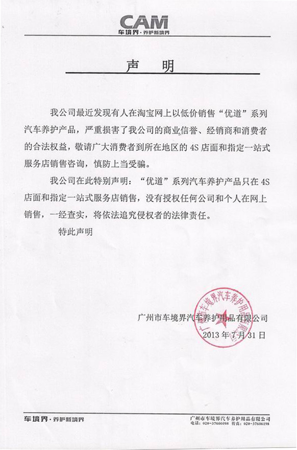 我公司最近發(fā)現(xiàn)有人在淘寶網(wǎng)上以低價銷售“優(yōu)道”系列汽車養(yǎng)護產(chǎn)品,嚴重損害了我公司的商業(yè)信譽、經(jīng)銷商和消費者的合法權(quán)益,敬請廣大消費者到所在地區(qū)的4S店面和指定一站式服務店銷售咨詢,慎防上當受騙。