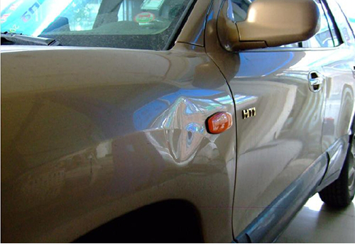 通過車身上的刮痕呈白色,這說明刮傷已經(jīng)傷及底漆。要修復(fù)這種漆面損傷,我們需要把相應(yīng)部位的車漆磨掉,然后進行鈑金修復(fù),最后重新噴上各層的油漆。對于噴漆時因操作失誤所造成的過量噴漆、流掛及橙皮紋等,可使用K33蠟進行快速修復(fù)。