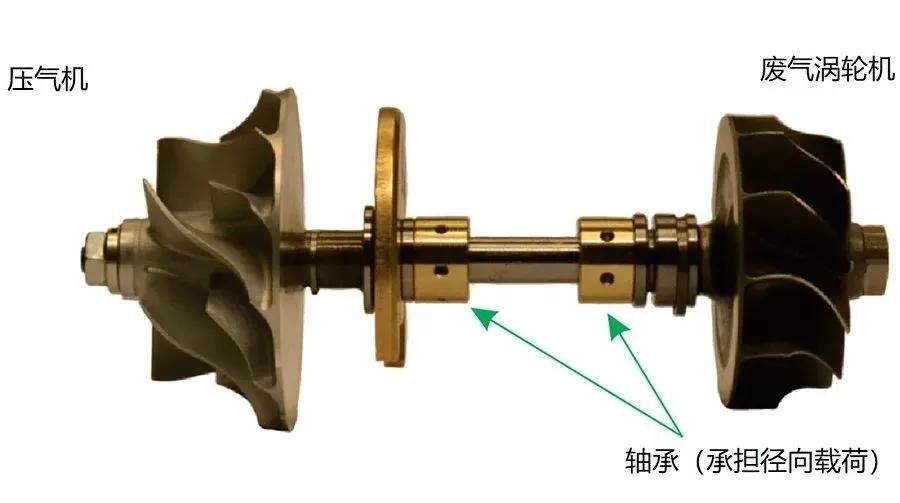 這是渦輪增壓器的轉(zhuǎn)子部分,廢氣渦輪端與壓氣機(jī)端由一根中間軸剛性連接,以一個(gè)整體在渦輪增壓器殼體內(nèi)高速旋轉(zhuǎn)。中間軸上安裝有軸承,減少轉(zhuǎn)子轉(zhuǎn)動(dòng)的阻力,兩個(gè)軸承還會(huì)共用一套設(shè)有潤(rùn)滑孔的軸承殼體,以保證機(jī)油能全部流入軸承所在的部位。軸承需要承受動(dòng)輒每分鐘十幾萬轉(zhuǎn)的工作強(qiáng)度,同時(shí)還要忍受高達(dá)700℃以上的溫度。因此,為軸承提供充足的潤(rùn)滑,是保證渦輪增壓器壽命的重要前提。