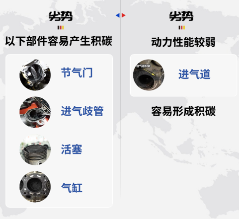 車輛行駛一定里程后,積碳就會(huì)遍布發(fā)動(dòng)機(jī)的各個(gè)隱秘角落,造成車輛油耗增加、動(dòng)力下降、積碳堵塞噴油嘴、燃油霧化不佳等現(xiàn)象,然后積碳問題又會(huì)進(jìn)一步惡化。