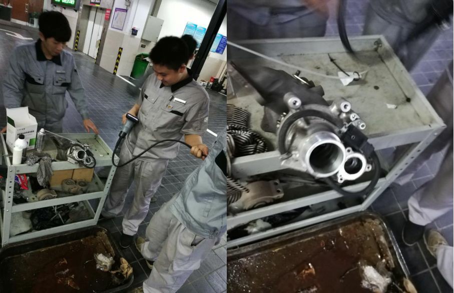 在凱迪拉克4S店內(nèi),師傅們直接將渦輪增壓器拆卸出來進(jìn)行施工,一邊操作一邊看著清洗出臟兮兮的油泥,尤其驚艷優(yōu)道渦輪清潔的效果。