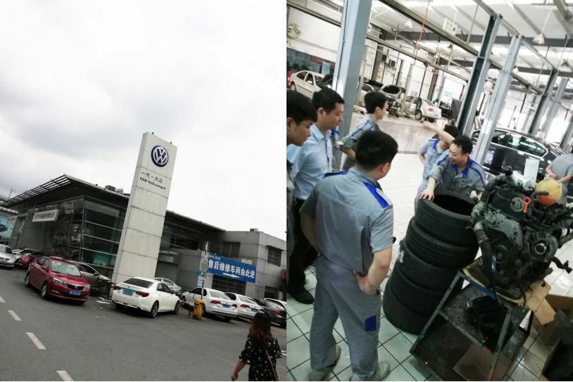 在株洲藍(lán)馬一汽大眾4S店內(nèi),優(yōu)道技術(shù)工程師和技術(shù)師傅們利用拆卸出來的發(fā)動機(jī)進(jìn)行了施工演示,大伙們都專心致志在一旁學(xué)習(xí)。
