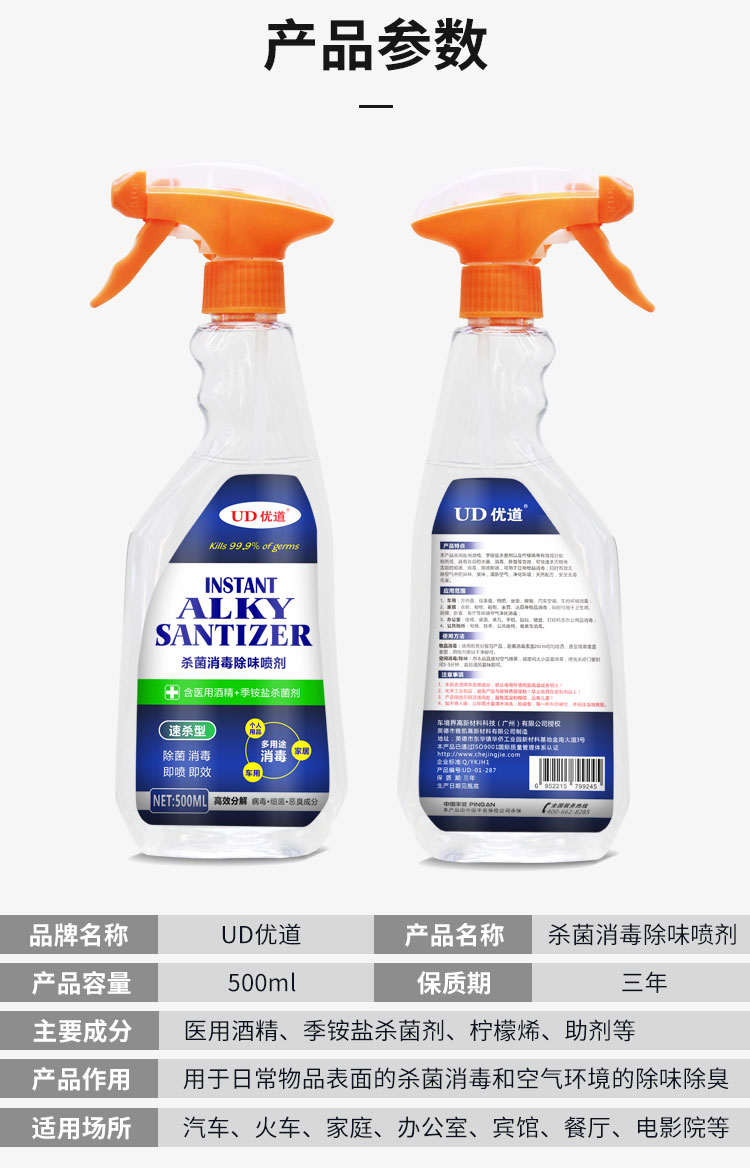 優(yōu)道車內(nèi)殺菌消毒噴劑,采用75%酒精、季銨鹽殺菌劑以及多種納米抗菌劑配制而成,具有優(yōu)異的殺菌、消毒、除臭等功效,可快速殺滅物體表面的細(xì)菌、病毒,即噴即效,可用于日常物品消毒;同時(shí)有效去除空氣中的異味、臭味,清新空氣,凈化環(huán)境;天然配方,安全無(wú)毒無(wú)害。