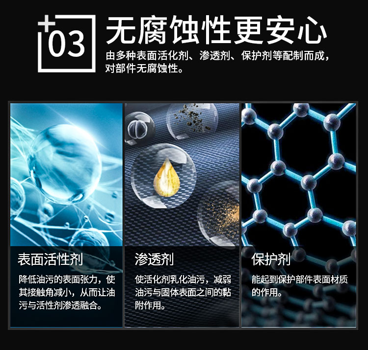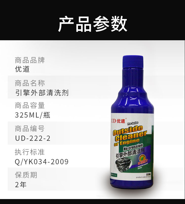 本品由多表面活性劑,滲透劑,保護劑等配制而成,產(chǎn)品分解去污能力強,對各種材質(zhì)的部件無腐蝕,對發(fā)動機表面的油漬,污垢物質(zhì)有很好的清潔作用。