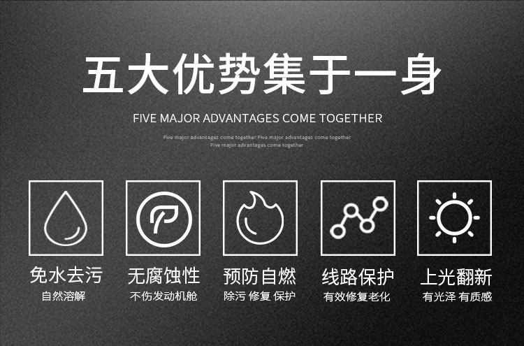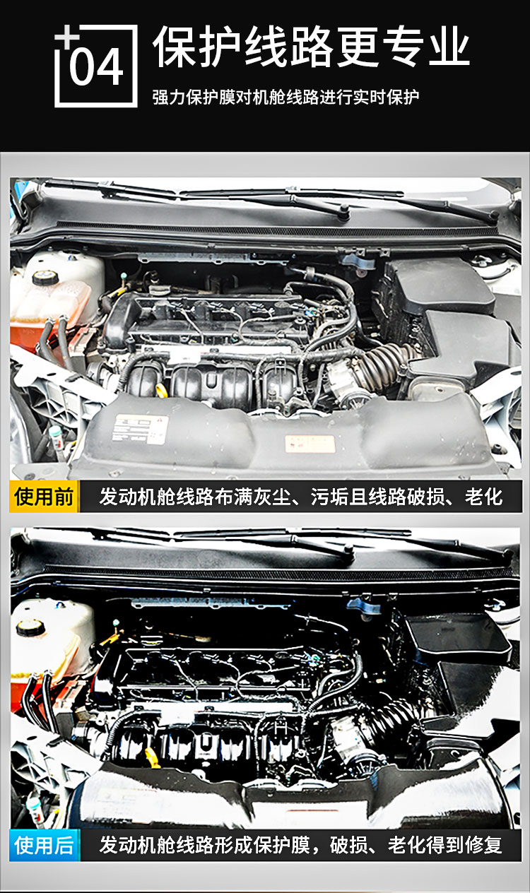 防止線路、線束、水管、皮帶等橡膠制品的龜裂老化現(xiàn)象;超強的滲透性能,能有效修復(fù)線路上的細微裂縫,使用后在發(fā)動機電路表面及接插頭處形成絕緣膜,隔絕水氣,抗氧化;防止線路開路、短路、爆裂,防止自燃事故的發(fā)生,提高汽車電路工作效率,還原發(fā)動機動力。