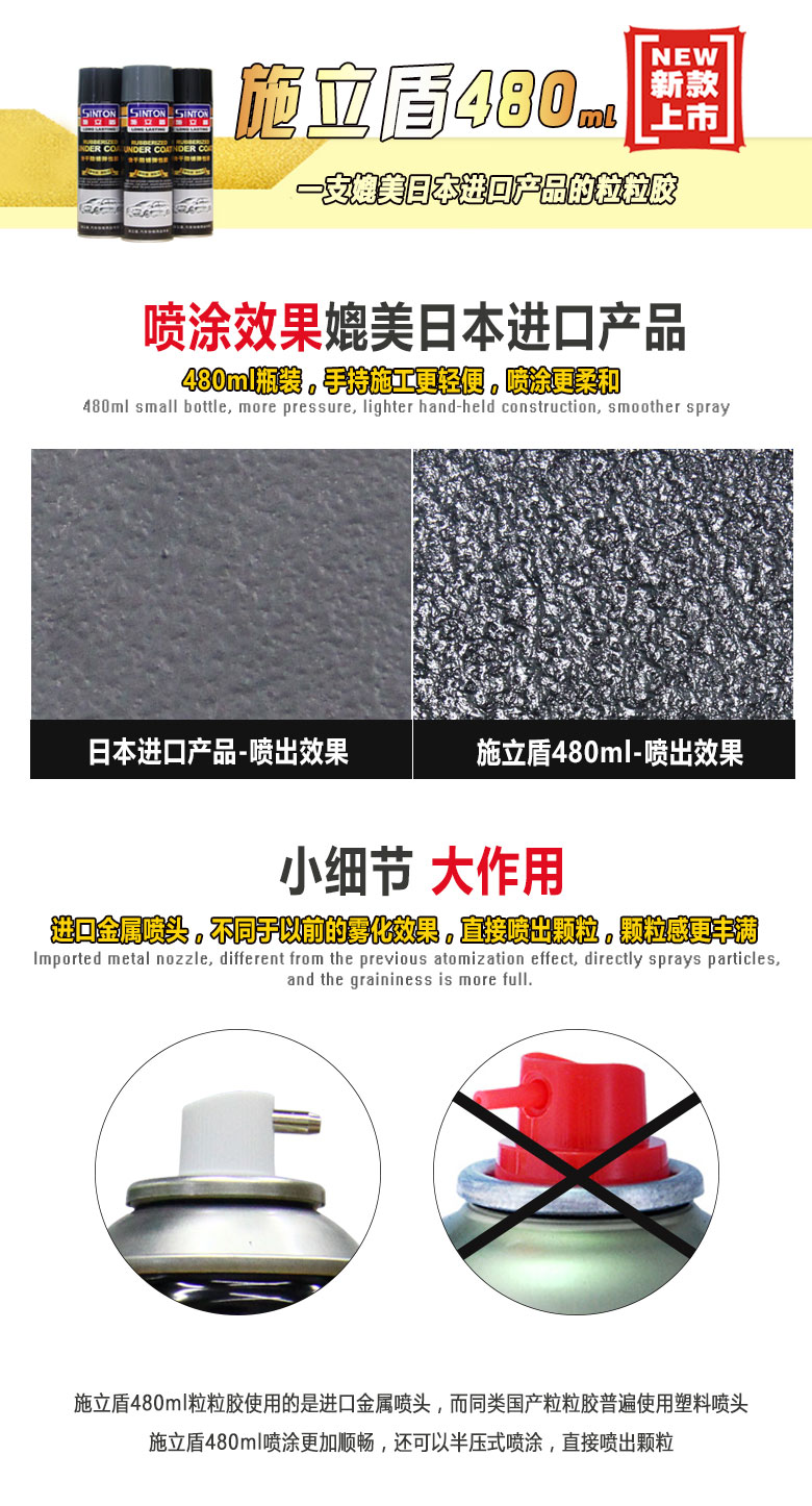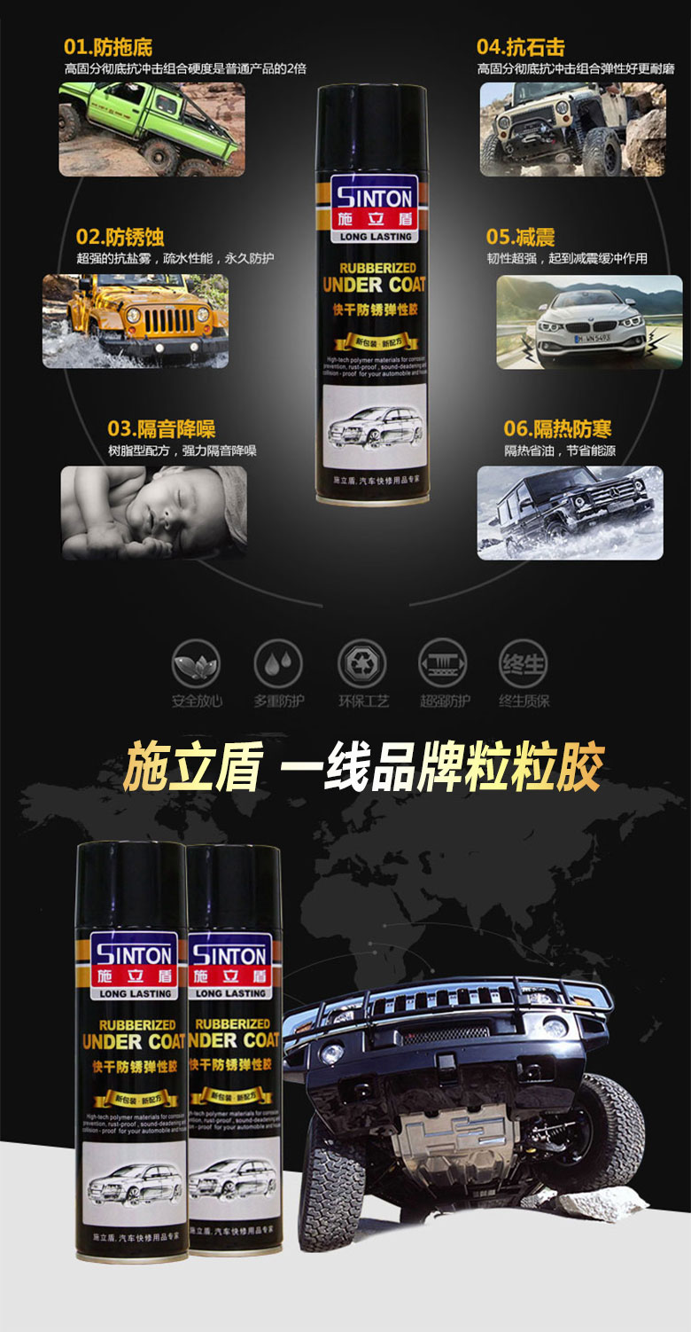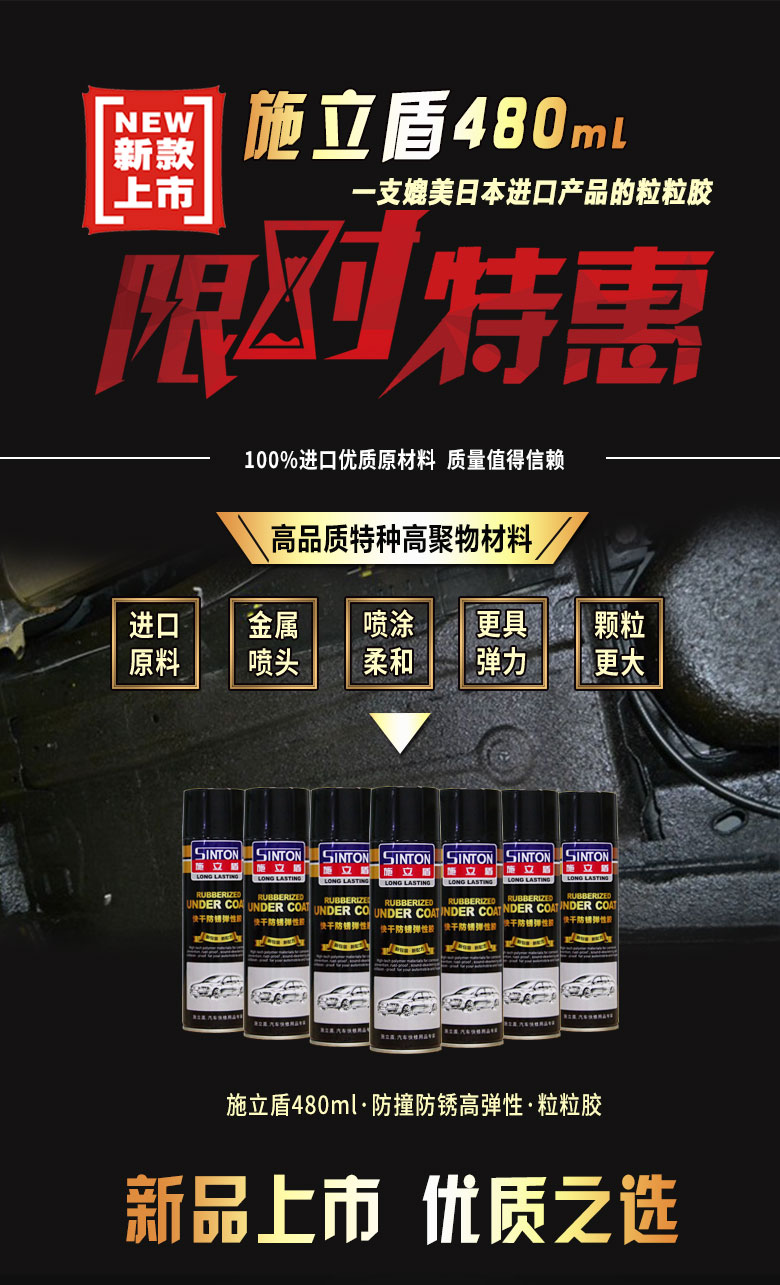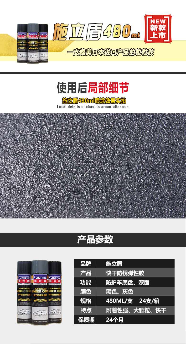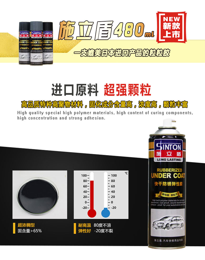 施立盾480粒粒膠,本產(chǎn)品采用特種高聚物材料進(jìn)口原材料,為快干型手噴彈性涂層,具有防銹、防水、隔音、堵漏有防撞擊等功能。固化后,可以在上面覆涂油漆,是一種多用途的車輛護(hù)理用品。