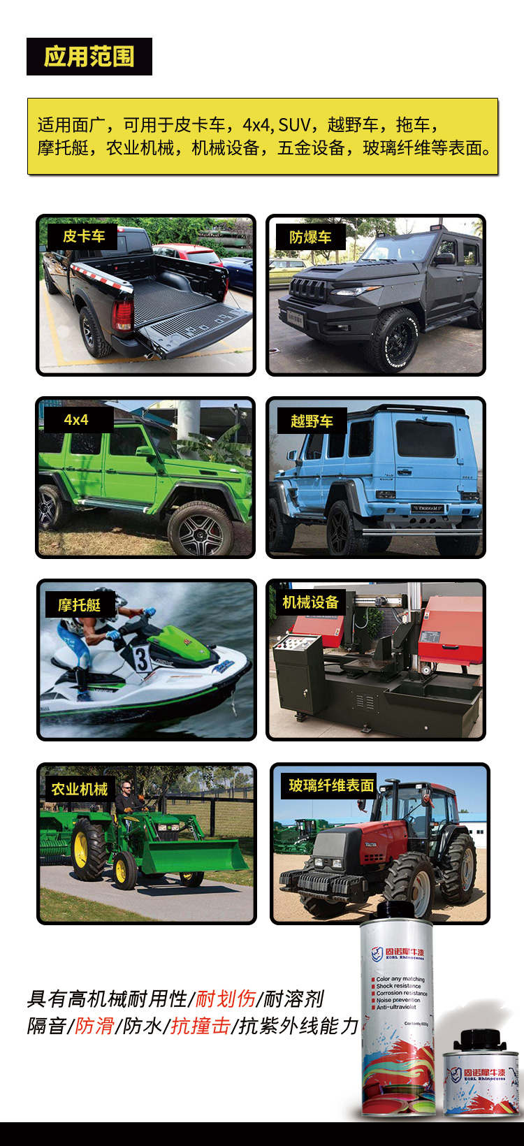 6H硬度的固諾犀牛漆噴涂后的滑面可永久性粘合,不會(huì)開裂和脫落,具有很強(qiáng)的封閉保護(hù)和抗沖擊力作用,非常適合高機(jī)械需求的游艇、輪船、越野車以及機(jī)械設(shè)備,以更好地防止擦傷,劃傷和腐蝕。尤其在強(qiáng)酸、強(qiáng)堿的極端情況下,只有這種耐腐性和耐磨性強(qiáng)的涂料才能經(jīng)受考驗(yàn)。
